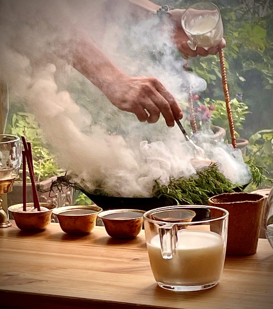 Das Rauchopfer Riwo SangChö wird traditionell am Morgen praktiziert. Das Verbrennen von Räucherwerk, begleitet von Meditation, Gebet und Gesang bringt Harmonie, Frieden und Segen.