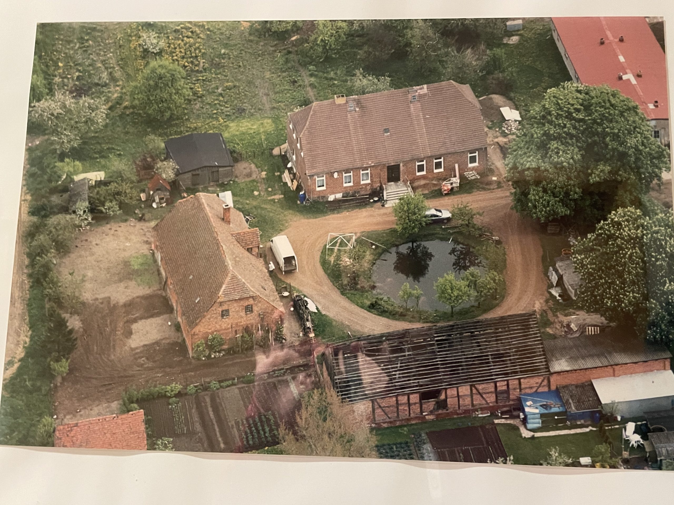 Die Gebäude des Pfarrhofs wurden um einen natürlichen Weiher herum errichtet. Die mit Reet gedeckte Scheune (im Luftbild unten) wurde in den 1990ern abgerissen.